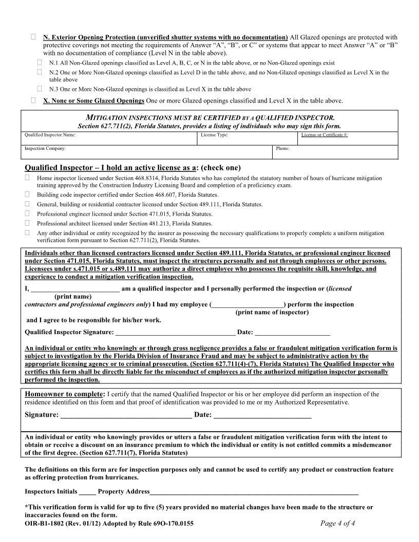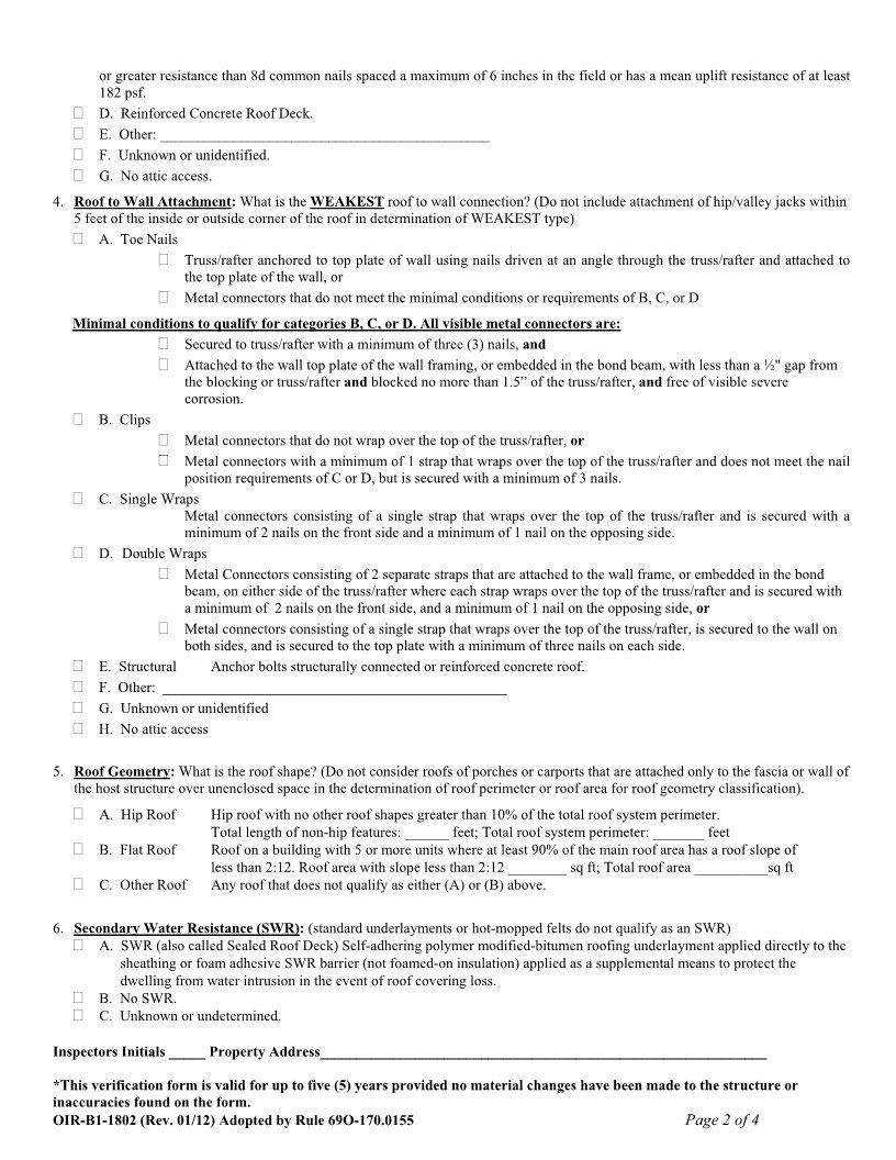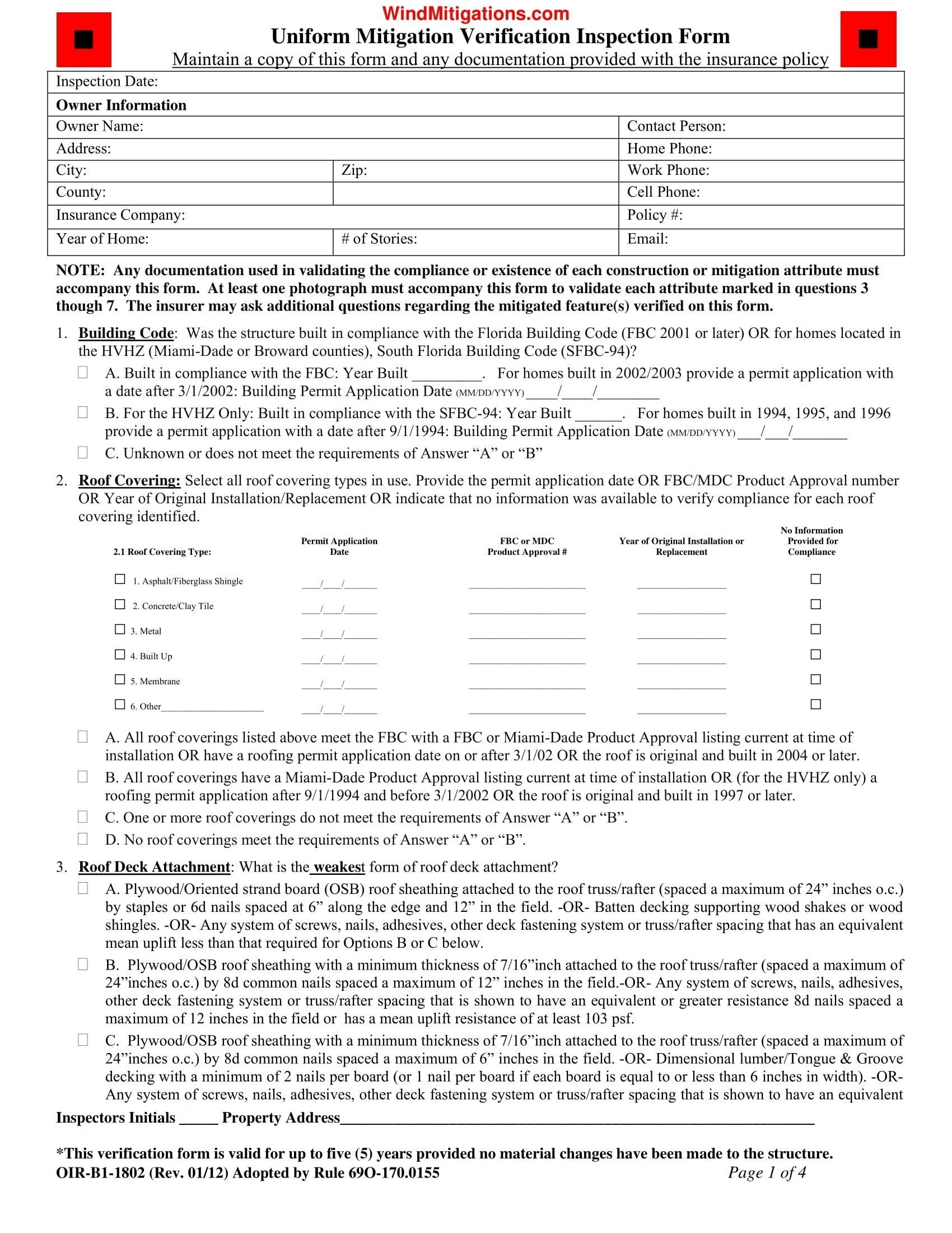The OIR-B1-1802 or Uniform Mitigation Verification Inspection Form consists of seven specific features that determine how wind resistant your home currently is. Significant discounts are typical if you have never had a wind mitigation inspection performed. The inspection is conducted by a Florida licensed professional that documents a home’s credited features and the ability to resist high wind events and hurricanes.