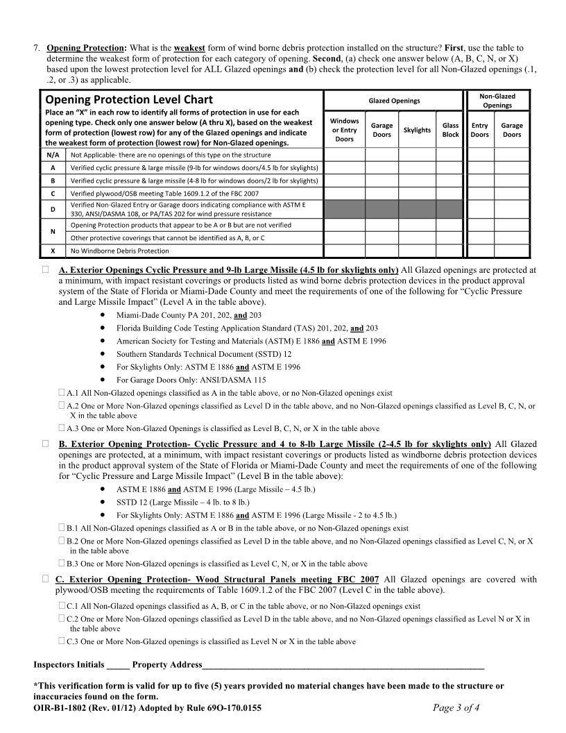 - Opening protection type present for glazed openings, solid doors and overhead doors.